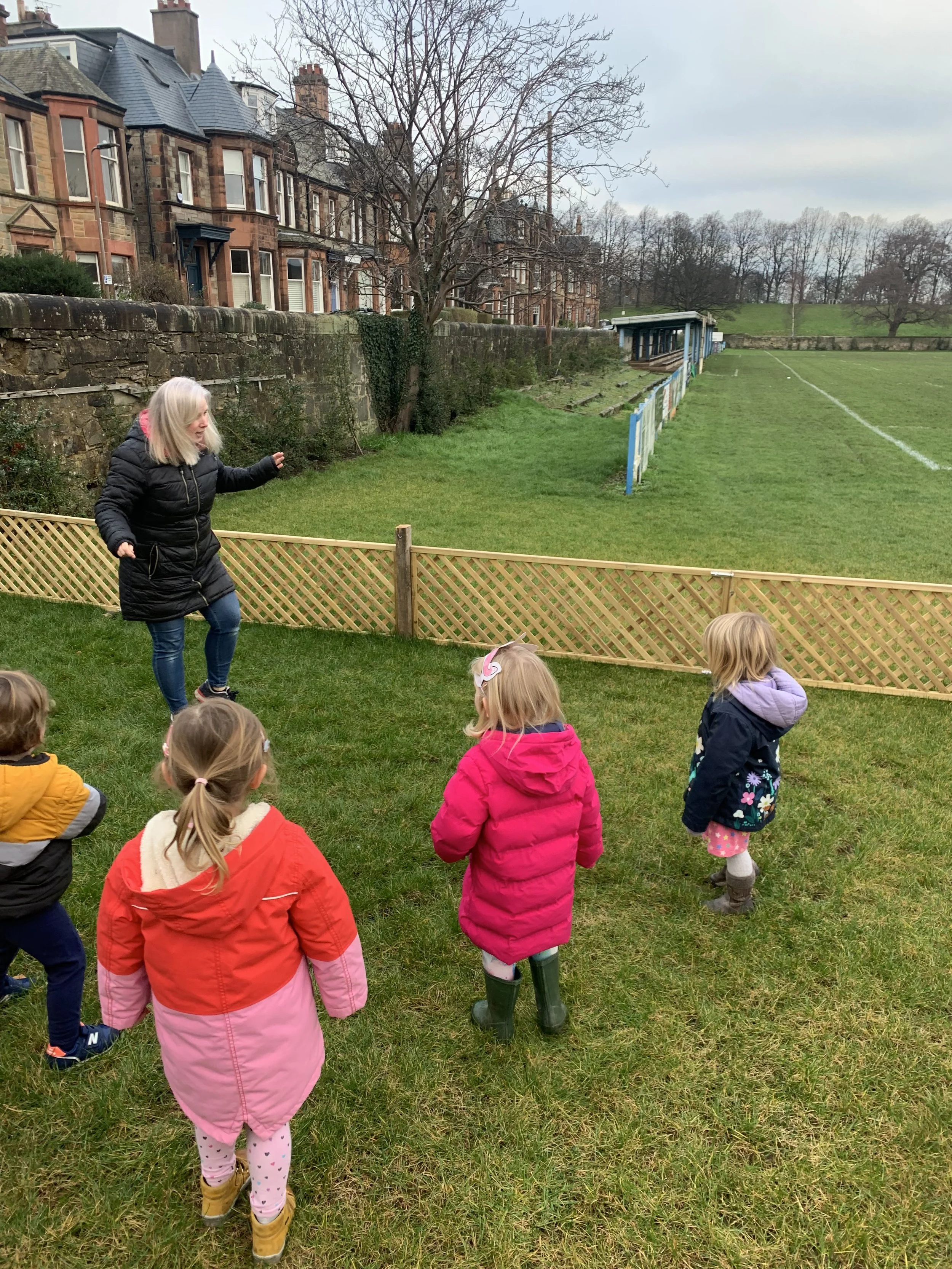 During the month of January, we gained access to our little garden space in the field behind the building, this is a great space for the little people to feel safe as it is surrounded by fencing. On one of our visits to the garden, Claire lead a Gruffalo themed activity! As you can see in the second picture below, the little ones were stomping on the ground, as the Gruffalo does when he’s walking through the deep dark woods!
